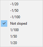 Opens a menu for setting or removing slope. This setting is applied when routing a pipe in the XY-plane and using the direction wheel to select the routing direction. Also selectable from the ribbon: Routing. After routing the slope angle can be changed with Change > Slope. The default values are defined in the shared project settings, as described in Routing.