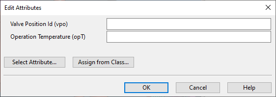 The Edit Attributes dialog opens. You can add and remove attributes and define their values, as required. If P&ID integration is used, you can link P&ID attributes to Plant Modeller. All mapped data is automatically filled in: if you are inserting a valve that has an externally defined position ID, then that ID is automatically filled in.