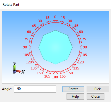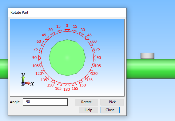 You are prompted to define the rotation of the component (not relevant if the cross section is symmetrical). You can rotate the component around its centerline by clicking a direction in the Rotate Part dialog or by typing the angle value and clicking Rotate.