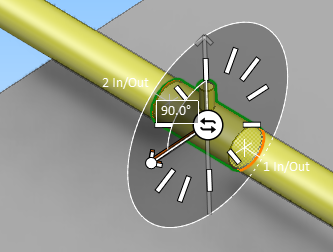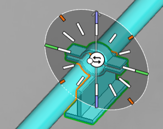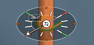 The work view displays a direction wheel for selecting how the component should be aligned in regard to the surface of the pipe. Click the required direction or use the Enter rotation angle (Alt+R) command to type the value. Then press Enter to continue.