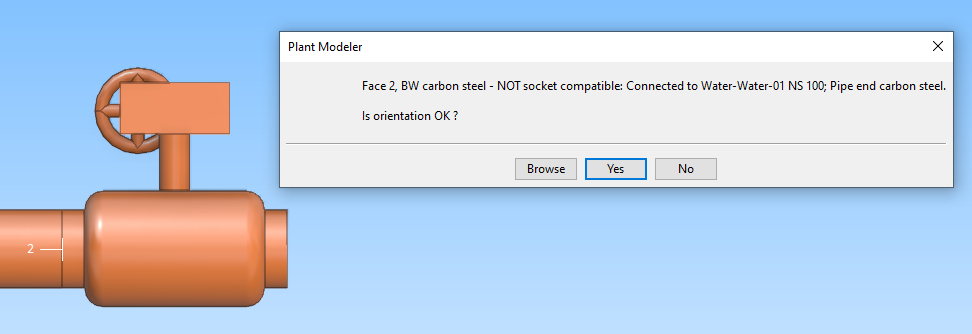 If the pipe is slightly sloped, you are prompted whether the component should ignore the pipe's deviation from a main axis; if you select Yes, the component will be at a slightly different angle than the pipe, which is sometimes wanted for simple pipe supports.