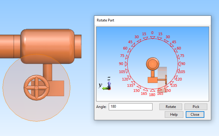 The work view displays a direction wheel for selecting where the component should be placed on the perimeter of the pipe. Click the required direction or use the Enter rotation angle (Alt+R) command to type the value. Then press Enter to continue.