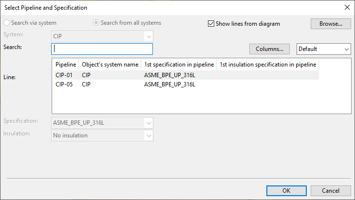Note: If the project uses P&ID integration and you are connecting the valve to the end of a pipeline that is defined in a diagram, the Show lines from diagram option is automatically selected; clear the option if you want to select a pipeline that is not defined in a diagram.