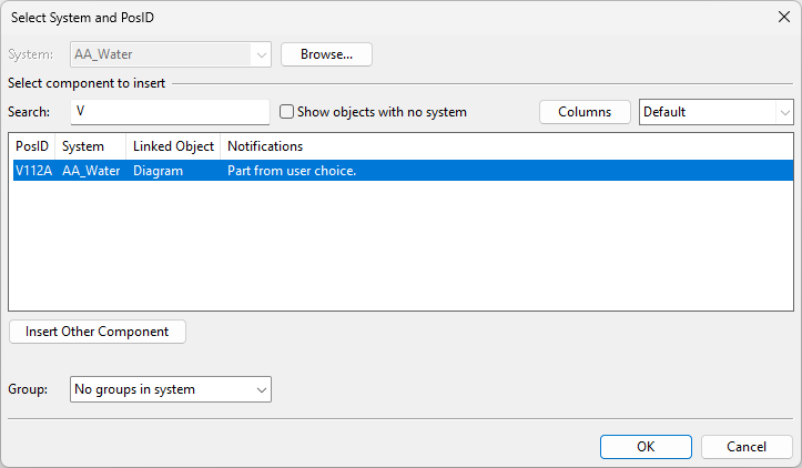 The Select System and PosID dialog opens automatically when you are inserting a Standard Component and the project contains integration objects that are not linked to a model object. If the dialog opens but is empty, either the integration objects are assigned to a different System than what is currently selected or they have no System assignment.