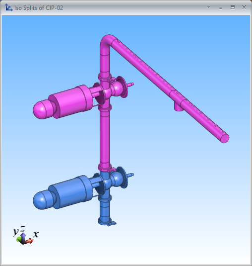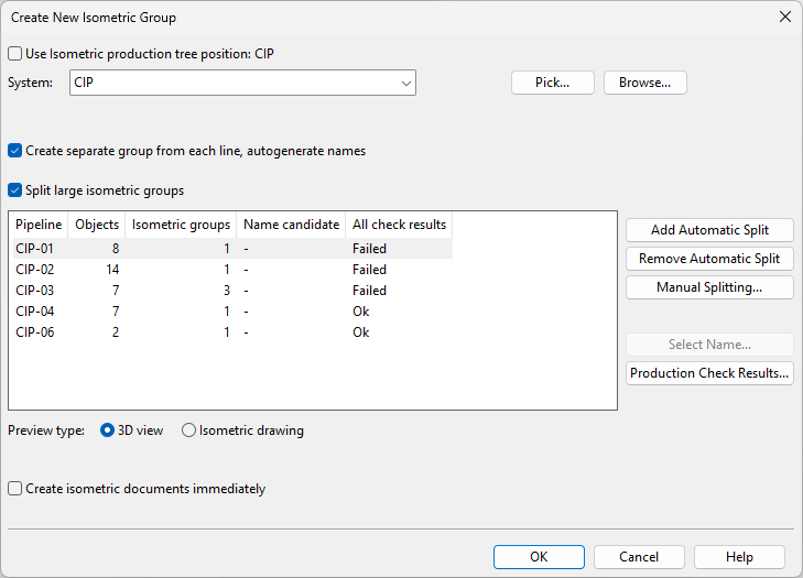 Split large isometric groups – Select this option to allow the program to split large piping systems into smaller isometric groups, based on the splitting rules your administrator has defined. The list pane shows the results of the splitting: the number of piping objects in each pipeline, the number of isometric groups to be created from those objects, the generated name of each isometric group, and current isometric check results. Selecting a row from the list pane shows the contents as a shaded 3D view that uses color to indicate how the objects are assigned to groups or as an isometric drawing, depending on the currently selected preview type.