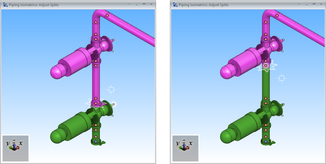 Manual Splitting – You can use manual splitting to assign piping objects into isometric groups, using a shaded view that shows the current split points with star-like objects. Use the commands in the context menu to add, move, and remove split points so that you achieve the required isometric groups. For details, see Split Isometric Groups.