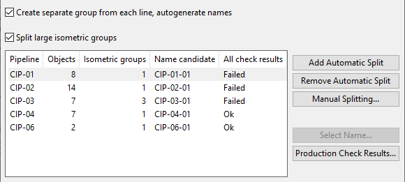 Create separate group from each line, autogenerate names – Select this option to assign each pipeline to a separate isometric group. If a pipeline seems to be too large for the document page, you can use automatic or manual splitting to divide it into smaller groups.
