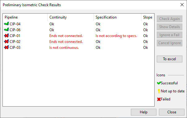 Note: These check results are only preliminary statuses that are not going to be saved. If you proceed to create the new groups, the program runs all the tests again and marks any failed tests with red exclamation marks in the Isometric Groups Pane. Then you can review the check results and manage them as appropriate, as described in Isometric Check Results.