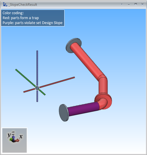 In this example, slope check has identified that the pipes form a trap and do not have enough slope, and the problems are demonstrated in a separate view.