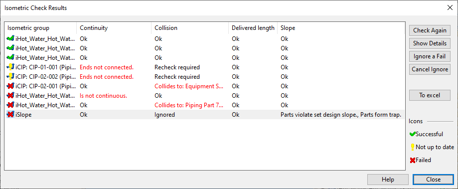 If the dialog lists isometric groups that have failed checks, investigate the problems and see if they can be fixed.