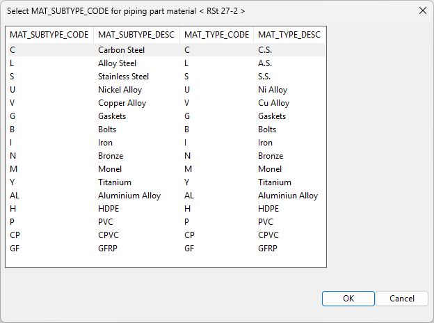 Cadmatic Weld Book MATERIAL_TYPES – This object defines material types using a combination of a material type code ("C") and material type description ("C.S.").