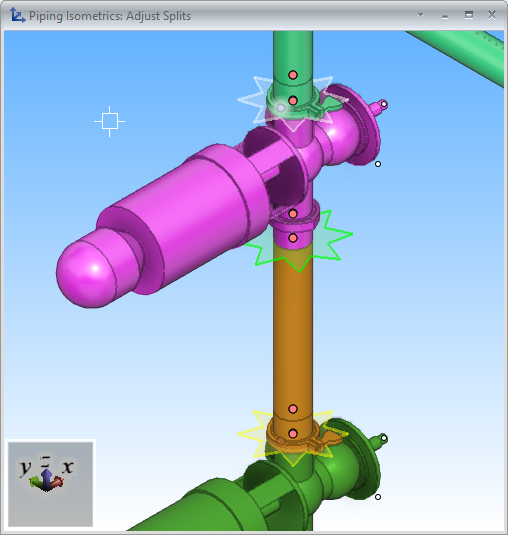 In the Create New Isometric Group dialog, the automatic splitting function is able to split large isometric groups into several smaller isometric groups. In some cases, you might want to adjust the results of automatic splitting manually. Selecting a pipeline and then clicking the Manual Splitting button opens the Adjust Splits view where you can define how many isometric groups to create and how to assign the parts in the given pipeline to different isometric groups. This is done by adding, moving, or deleting split points which are always located in a connection point or pipe geometry point. Split points display a transparent, star-shaped marker whose color indicates whether the split point has been automatically (yellow) or manually (green) placed or whether the point is currently active (white).
