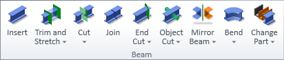 On the Structural tab, the Beam group provides tools for inserting and modifying beams. You can also move, rotate and mirror, and delete existing beams with the tools in the Edit group.