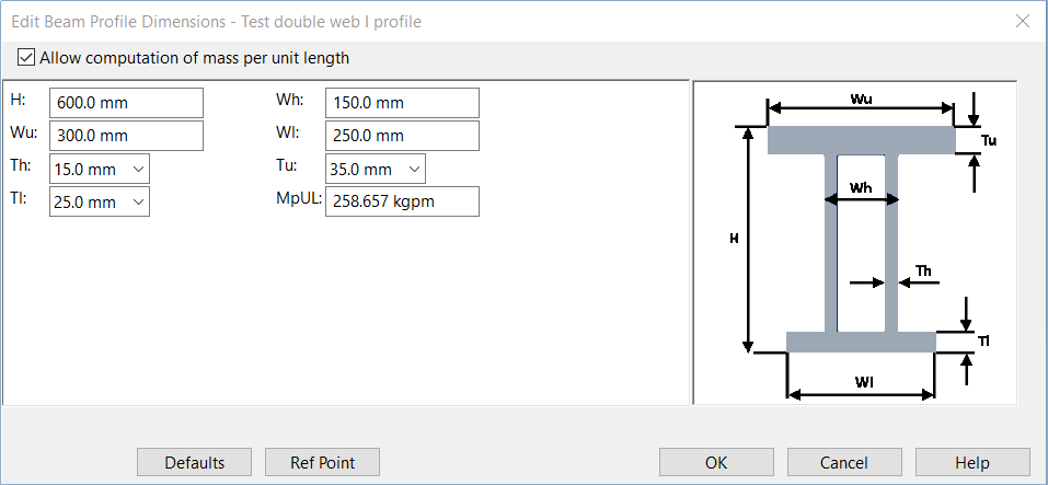 Allow computation of mass per unit length allows the value of the MpUL field to be calculated from the cross-section area of the beam profile. When opening the editor, this option is automatically selected if the current value matches the computed value. If you manually select this option, the current Mass per Unit Length value is replaced with the computed value.