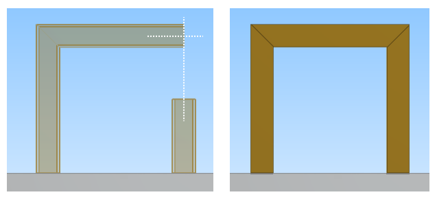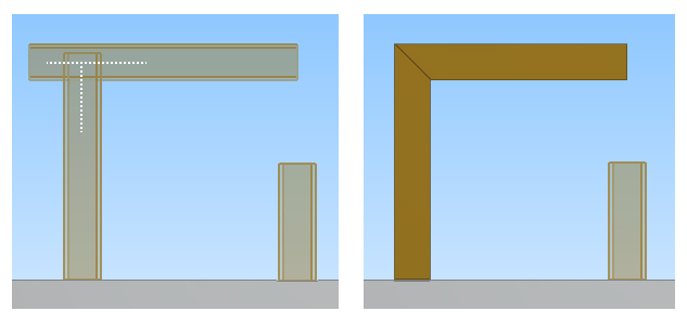 Then, we use the tool on the horizontal beam and the shorter vertical beam. Their projected centerlines intersect, so the tool stretches the shorter beam and trims the beam ends to form the miter joint.