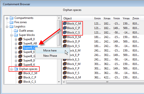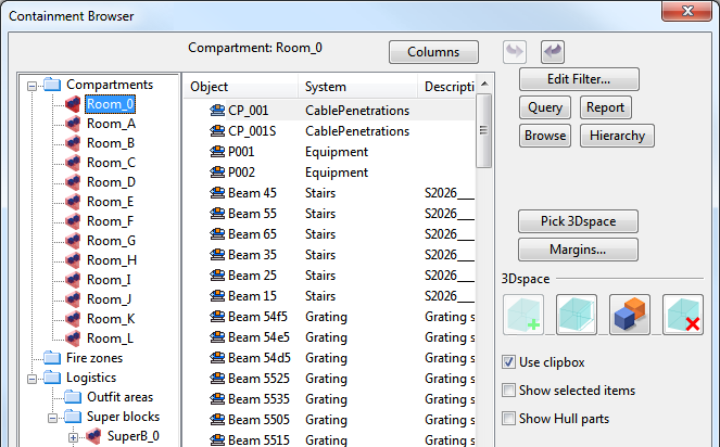 When you select a tree item that represents a branch in a containment hierarchy then all 3D spaces that match that hierarchy are shown in the list window and visualized in a browser view. 3D spaces become visible even if have set them to be inactive.