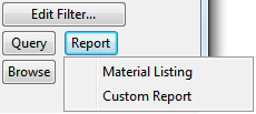 The Report button allows you to generate either an ICGD-based material listing or a custom report. The latter calls the ContainmentBrowserReporter.mac script and searches it from standard places (including COS). All items in the currently active containment tree branch are included in the report. If Material Listing is selected, then groups are expanded. With Custom Report, groups are present in the object set that is passed to the custom reporter. There is an example script, PMS_HOME/syst/pm/macro/Examples/ContainmentBrowserReporter.mac, that demonstrates how the containment browser interfaces with the custom reporter.
