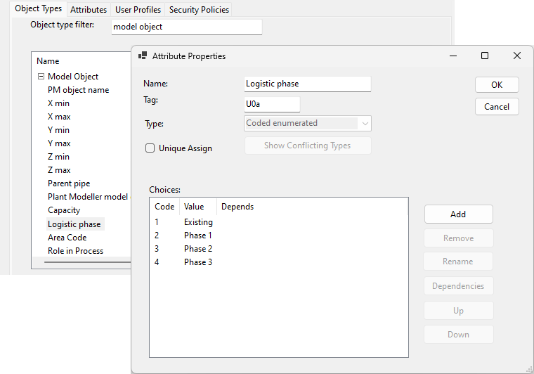 The CADMATIC example project includes the 'Logistic phase' attribute. This is a 'Coded enumerated' attribute assigned to the 'Model Object' object type.