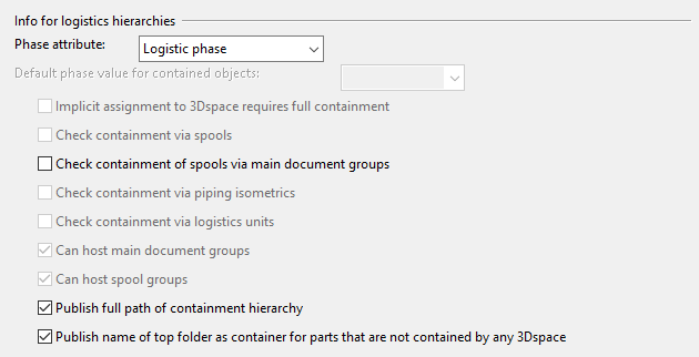 Phase attribute – This option specifies a COS attribute whose values define the logistics phases that containment can represent. An implicit logistics containment, evaluated based on location, can also be configured to produce a default phase value. This same default value is used for objects that are explicitly assigned, but without a phase. The default phase value of contained objects can only be configured for real logistics 3D space types, not for plain folders. Additionally, the default phase value of contained objects can vary across different levels of the logistics hierarchy. If a model object is logistically contained by a 3D space, a phase value that more accurately specifies the model object's relation with, for example, a ship block, can always be published. The containment browser will automatically display these phases in the tree.
