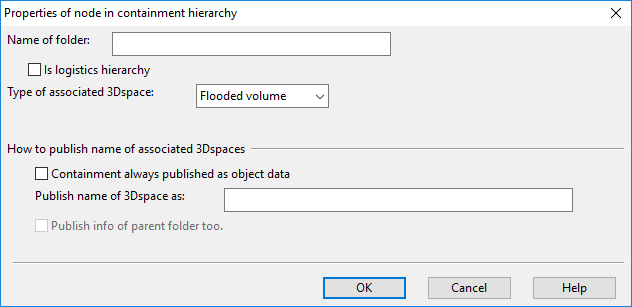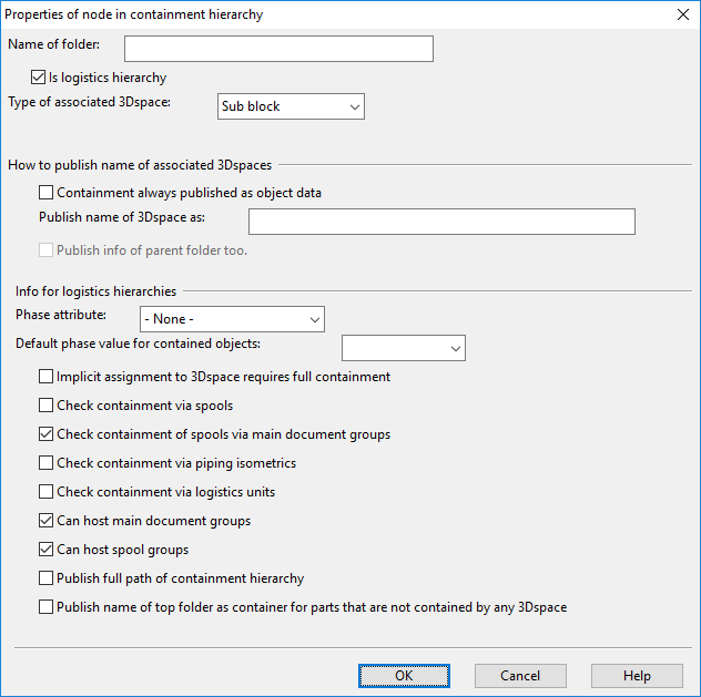 Publish name of 3Dspace as – Enter a descriptive name for this containment in the published object data. This name will be visible in the object properties and when creating selection tests for queries. This name does not have any direct connection to the name of the folder or to the name of any existing attribute. You can also use your local language for this name.