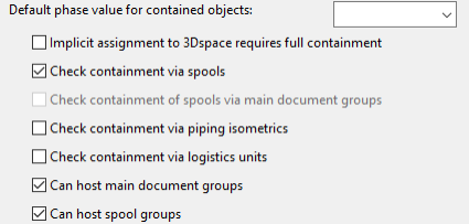 Check containment via spools – If this option is selected, all parts of a spool will inherit the same containment, even if they belong to different 3D spaces. This also applies to cases where a spool has been explicitly assigned to a 3D space; in such cases, all of its parts will be contained within the same 3D space and inherit information from it.