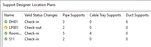 In the Support Designer: Location Plans dialog, you can add, modify, and remove location plans, and access the supports of a given location plan.