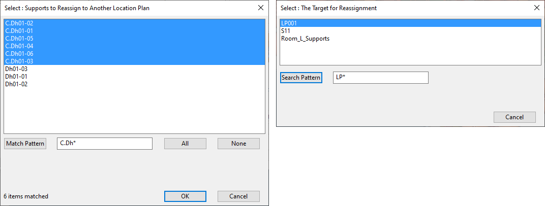 Starts the process of moving supports from one location plan to another. Tip: You cannot rename a location plan directly, but you can use the reassign function as a workaround: create a new location plan with the desired name and transfer the supports from the old location plan to the new one. |