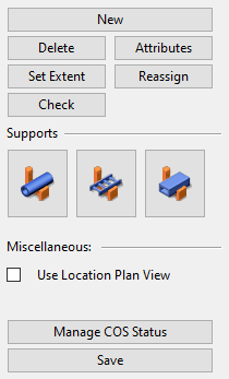 Opens the Manage Location Plan COS Status dialog where you can check in/check out and request/relinquish the ownership of location plans and the related objects. See Managing the COS status of location plans and supports. |