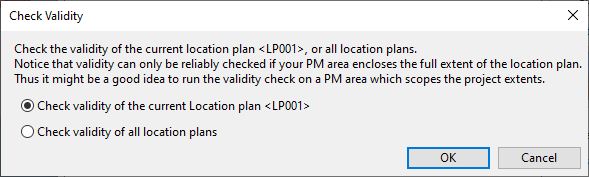 Allows you to run a validity check for the selected or all location plans. If the validity check found errors, a report opens as a text file. The report indicates, for example, if a support construction has no primary or secondary supports or if a support is not inside the designated location plan. |