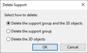 Opens a dialog for selecting whether to delete both the support group and the 3D objects (including objects created outside Support Designer) or just the support group or the 3D objects.