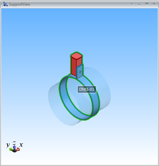 The support objects are shown in X-ray mode, and the neighboring objects are shown as transparent. The view is a normal, shaded work view that can be freely rotated. The support ID is displayed as an overlay text at the center of the support in all open work views.