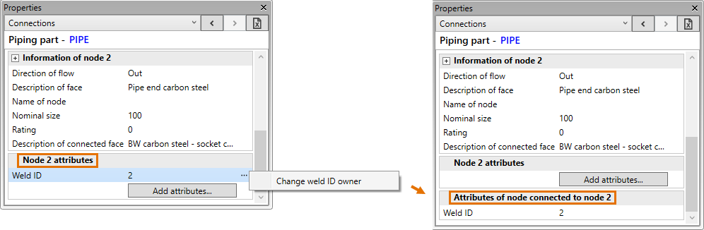 Assigning a model object to an isometric group generates weld IDs for welded connection faces, provided that the project administrator has enabled the relevant option in Isometric Groups. This feature enables the generation of weld ID labels in isometric drawings. If specific connection faces do not receive this label, it may be because the assignment rules have assigned the weld ID to the part not visible in the drawing. In the Properties pane, these instances can be corrected by using the Change weld ID owner function to transfer the 'Weld ID' node attribute to the part that is displayed in the drawing. To use this function, both model objects must be checked out to you, the target object must be a member of an isometric group, and the target node cannot be a branch anchor point.