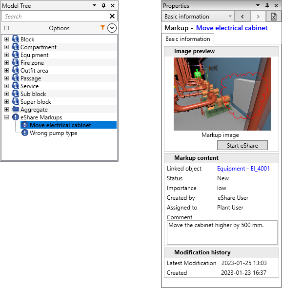 Image preview – Shows a preview of the markup image. Photos attached to the markup in eShare cannot be displayed in Plant Modeller, but if your user account is permitted to access eShare you can click Start eShare to see the actual markup in eShare.