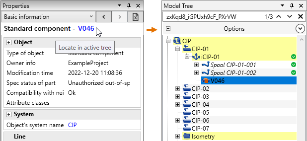 At the top of the Properties pane you can see the type and the name of the currently selected entity. The blue name is a link that you can click to select the entity in the Model Tree pane. This also highlights the hierarchical structures where the entity is located.