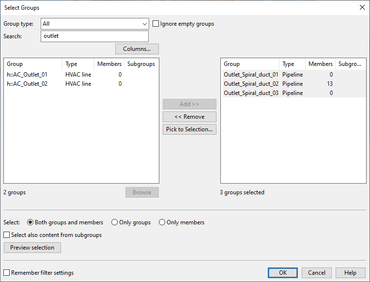 In this example, we are creating a new group called "Outlet_Pipelines" and we use the pattern "outlet" to find and select the pipelines that we want to have as the members of this new group. We select the option Both groups and members because we want to use this group, for example, for moving the associated model objects to a different location.