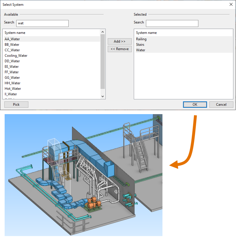 Alternatively, click Pick, pick an object from the model, and press Enter to add that object's System to the Selected list.
