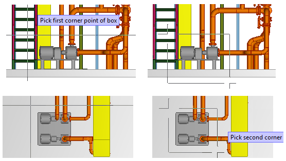 This selection method selects objects that are at least partly inside a box. The box is defined picking two opposite corners of the box.