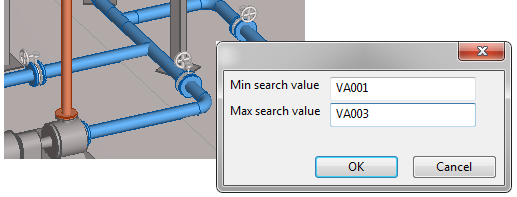 If the type of the attribute is flag, then all objects having that attribute assigned will be selected. Otherwise, you are prompted to define the minimum and maximum values for the attribute, and the program selects the objects that have the specified attribute and the attribute value is acceptable.
