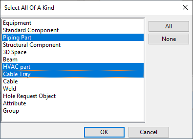 This selection method opens a dialog for selecting all objects of a given type. Click an item on the list to select it or to clear the selection.