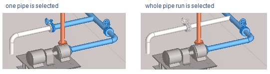 This selection method selects all components between two connection points in pipe, cable tray or ducting run. The method automatically picks a connection point inside the hit distance.