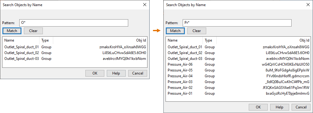 This selection method opens the Search Objects by Name dialog where you can define a name pattern and then, depending on the context, select one or several items whose object type is Group, Attribute, Equipment or Structural Component.