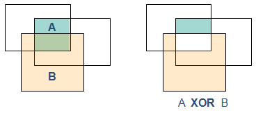 XOR – Selects objects that are either in set A or in set B, but not in both.