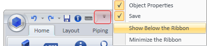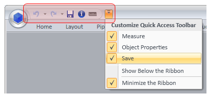 Quick Access Toolbar is located above the ribbon by default, and it provides access to commands that you use most frequently. By default it contains the commands Undo, Redo, Save, Object Properties, and Measure, but you can customize it to contain the commands that you want to have there. Of the default commands Undo and Redo cannot be hidden, but Save, Object Properties, and Measure you can show or hide by selecting them from the drop-down menu.