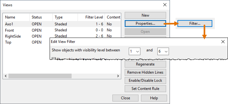 User can set each view to use a custom filter level range such as 1–3, which allows only those objects whose visibility level is within that range to be visible in the view.