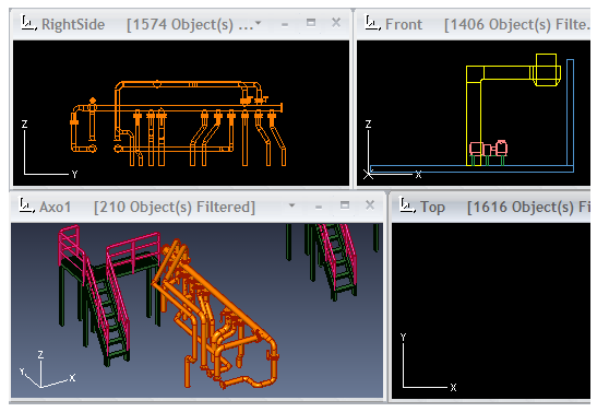 In the RightSide view, the filter level is 2–6, so only the objects (pipes) whose visibility level was set as 2 are shown (other objects are level 0 or 1).