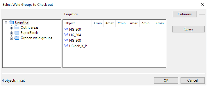 Use the hierarchical tree to select each weld group that you want to check out from COS. The selected weld groups are listed in the Logistics pane.