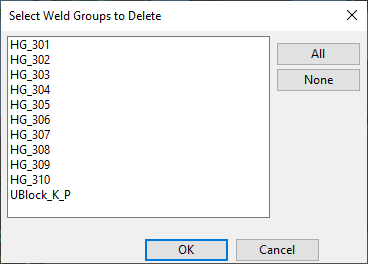 Select Delete. The Select Weld Groups to Delete dialog opens, listing the weld groups that are checked out to the area.