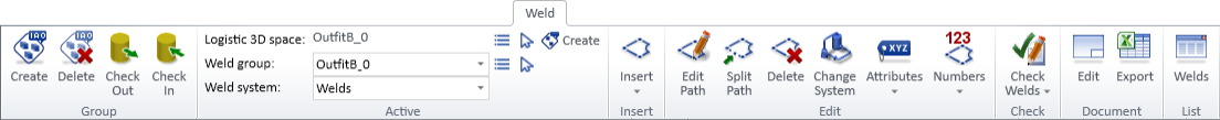 The Weld tab of Plant Modeller contains tools for managing welds and welding documents. This tab is only displayed if the loading of welds into the model is enabled in the Area properties.