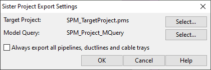 Always export all pipelines, ductlines and cable trays – In this tutorial, you do not select this option as you are not going to use CADMATIC P&ID. Only the lines that are referenced by other exported objects are in the scope and created or updated in the target project.