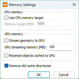If CPU memory target is not used, GPU memory can be used. Stream geometry to GPU controls the streaming of triangulated geometry to GPU. Enabling or disabling this option requires